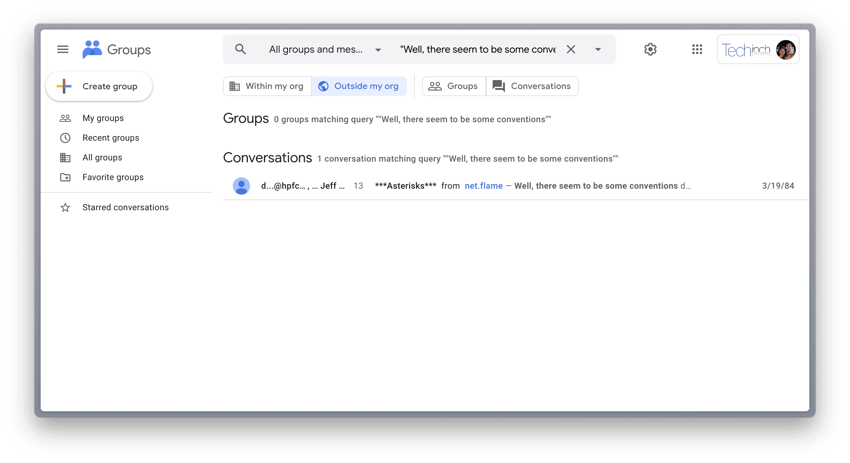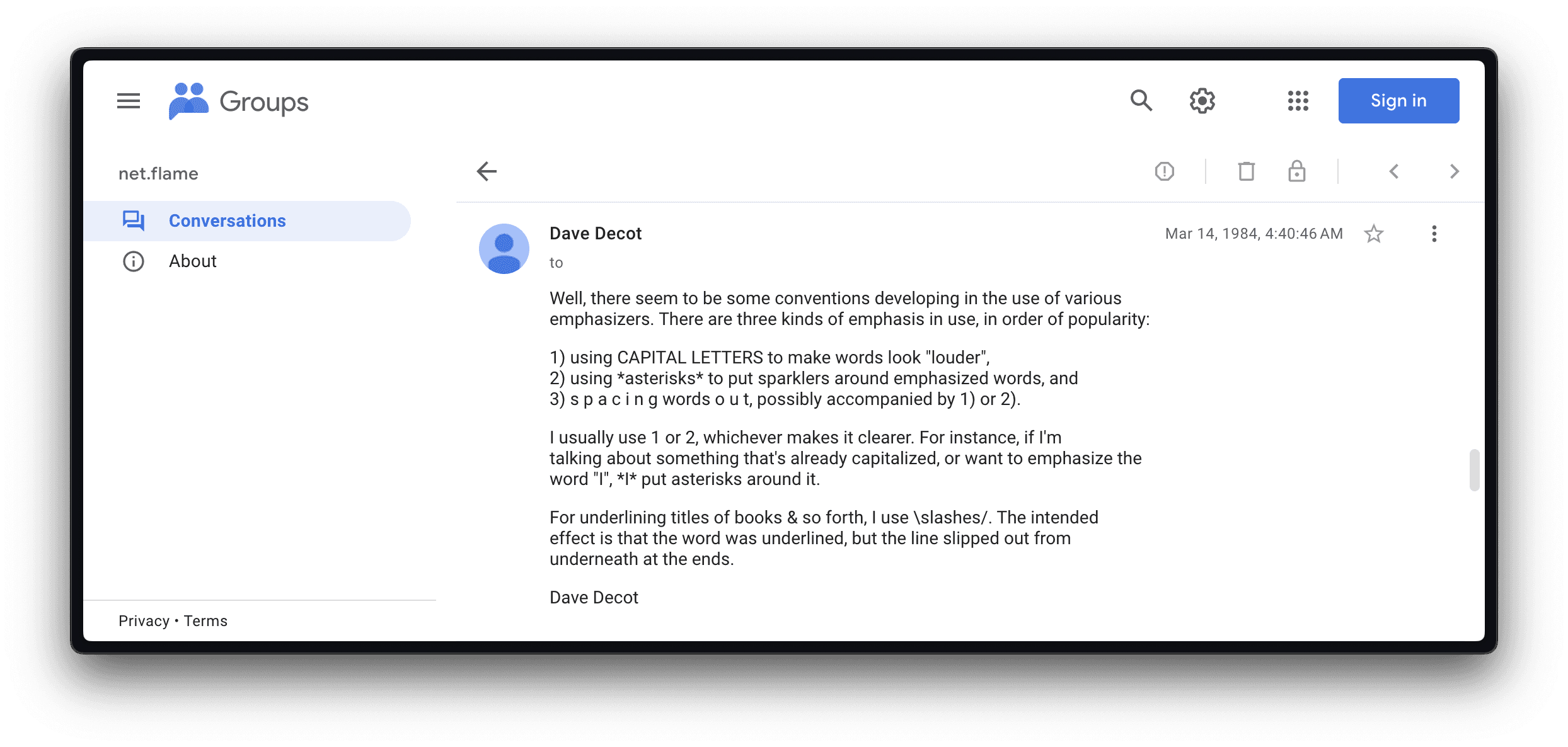 That link today redirects you to your Google Groups account—not exactly the content you were looking for. To reach the original Usenet discussion, replace /forum/#21msg/ with /g/, then add a /c/ after the Usenet group name (net.flame in our example) and add a /m/ between the first random character string and the second.